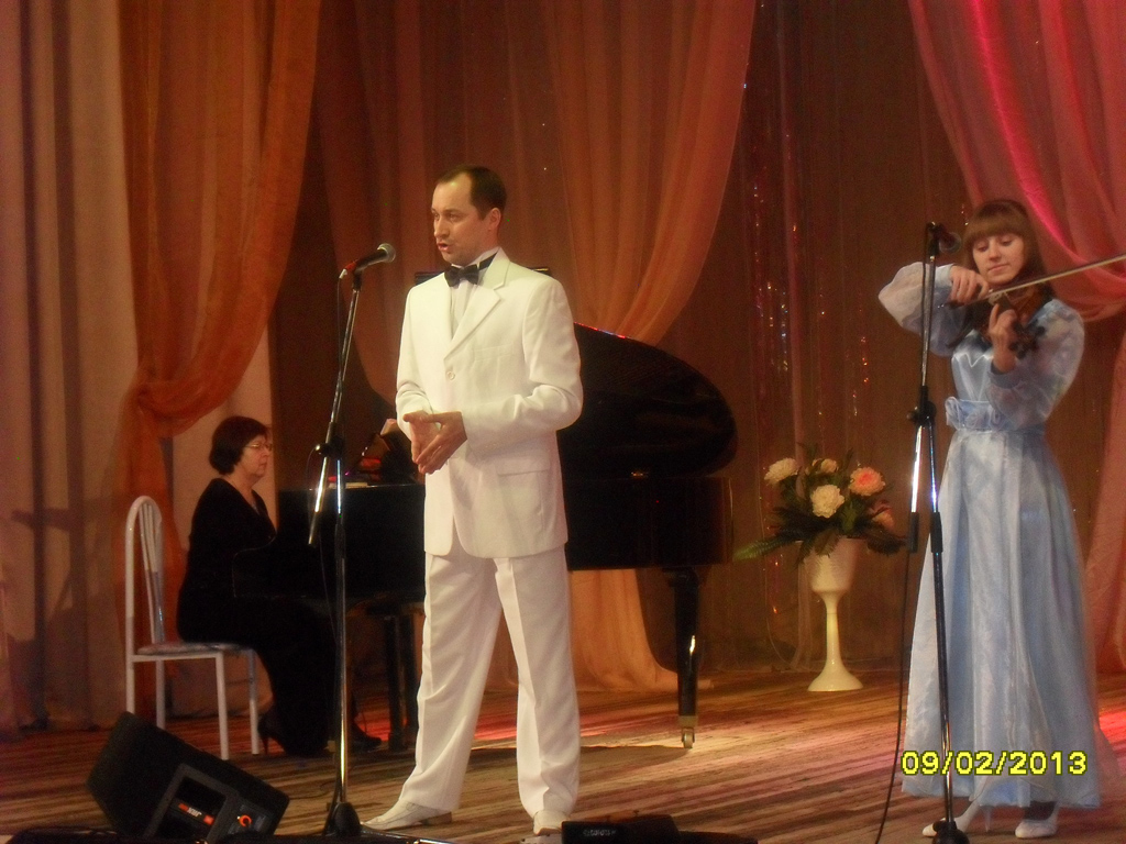 Первым услаждал слух Юрий Мурашов под аккомпанемент рояля и скрипки (Л. Смаглиева, Е. Евстафьева), был исполнен романс «Слушайте, если хотите». И этот, и последующие романсы Даргомыжского, Глинки в исполнении Юрия Мурашова были встречены бурными аплодисментами и криками браво. Безусловно, и певческий, и актёрский талант Мурашова подкупал, и чарующий живой звук благородных инструментов, но нельзя было не заметить, как органично была подобрана одежда выступающих: длинное строгое бархатное платье концертмейстера, нежное, подчёркивающее молодость, концертное платье юной скрипачки. Всегда приятно, когда выступление продумано до мелочей.