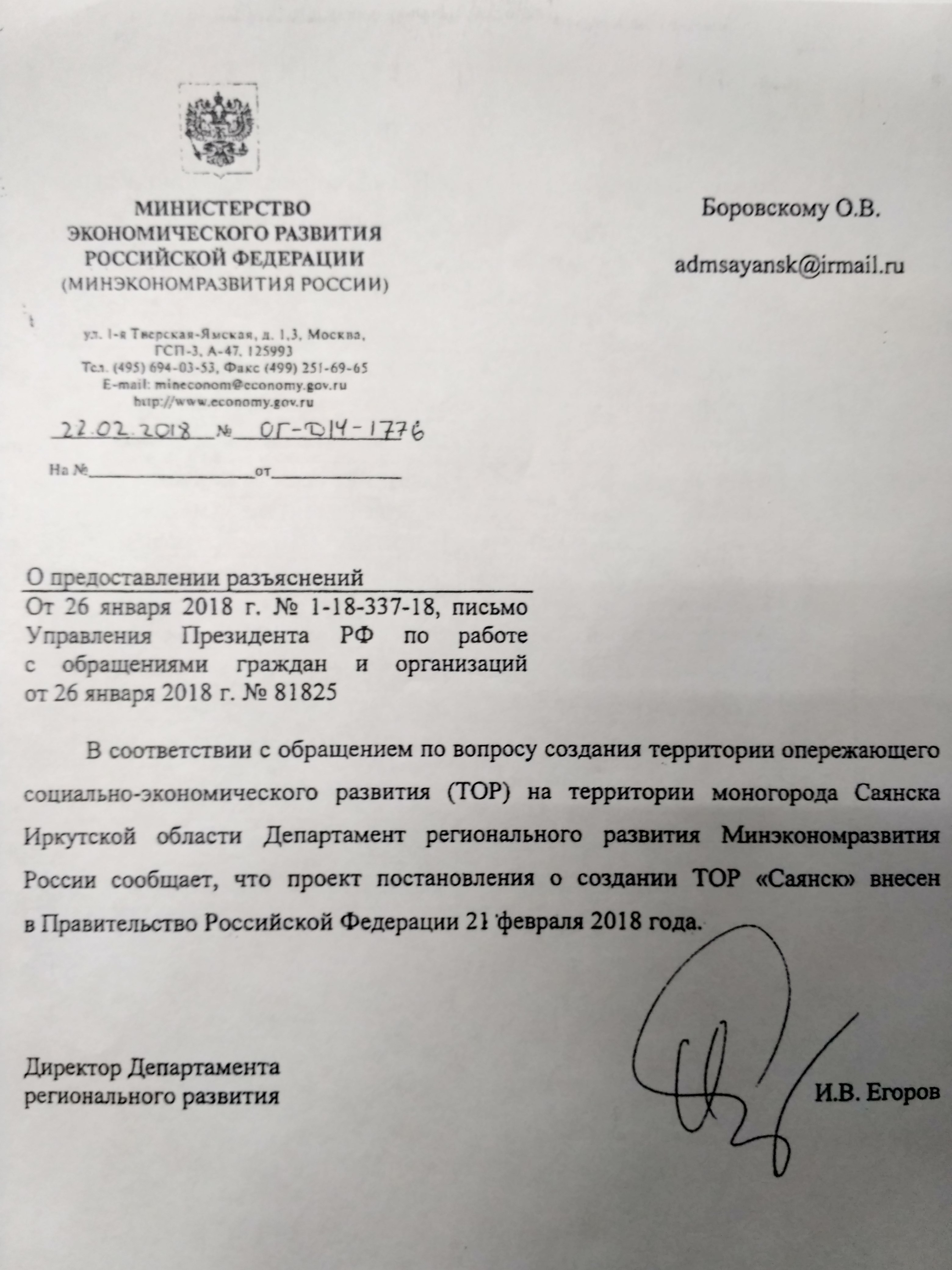 В адрес мэра города Саянска О.В.Боровского направлено письмо из Минэкономразвития РФ за подписью директора Департамента регионального развития И.В.Егорова, в котором говорится: «В соответствии с обращением по вопросу создания территории опережающего социально-экономического развития (ТОР) на территории моногорода Саянска Иркутской области Департамент регионального развития Минэкономразвития России сообщает, что проект постановления о создании ТОР «Саянск» внесен в Правительство Российской Федерации 21 февраля 2018 года.