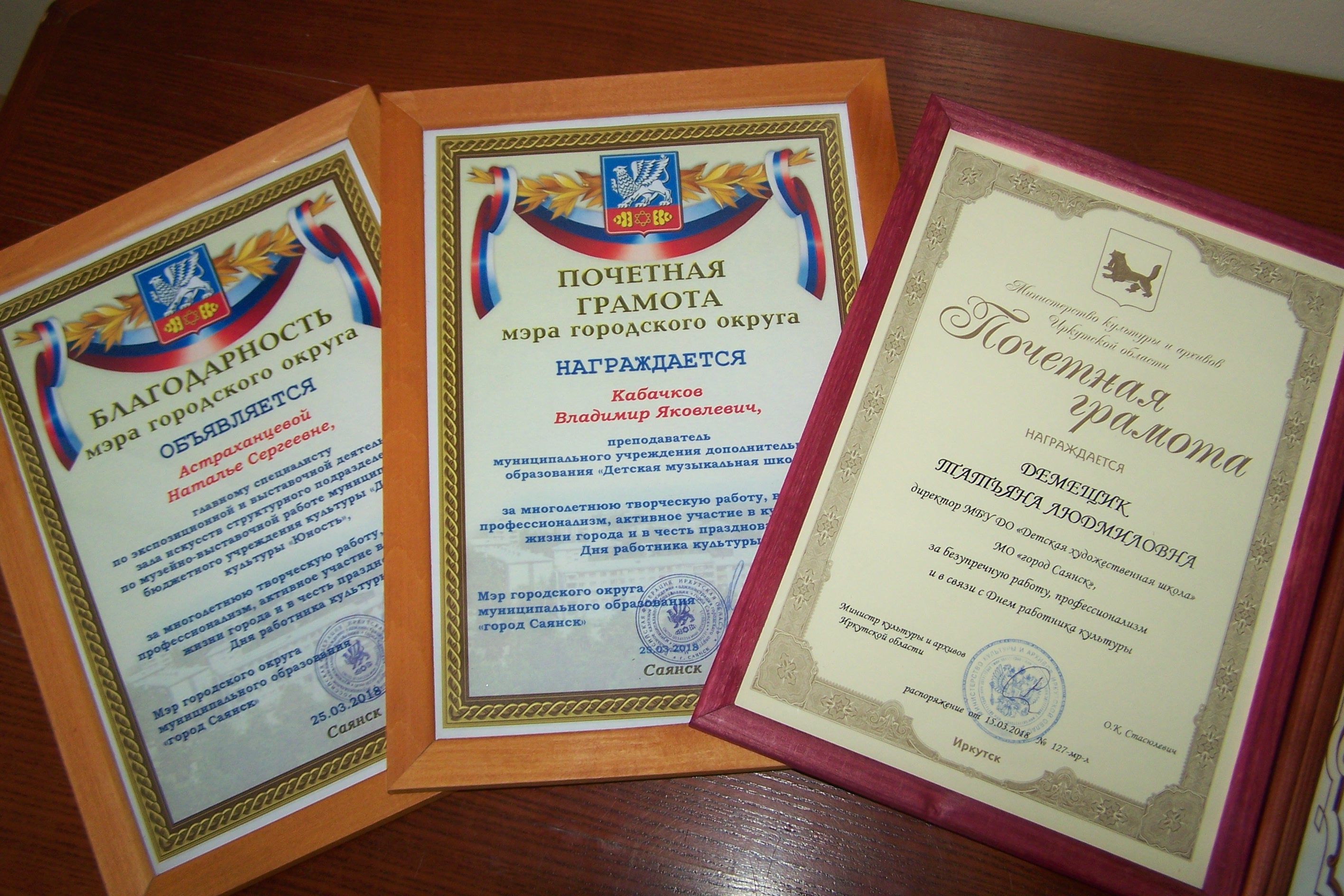 Заместитетель мэра по социальной работе Александр Ермаков и начальник Управления культуры Светлана Каплина вручили Почетные грамоты и Благодарственные письма от Министерства культуры и архивов Иркутской области, мэра города, Управления культуры, председателя городской думы наиболее отличившимся сотрудникам. Кроме того, они поблагодарили всех виновников торжества за работу и стремление к творчеству. Как отметила Светлана Каплина, Саянск может гордиться творческими коллективами города, одаренными детьми, которые выбирают своей судьбой служение культуре. В настоящее время в детской музыкальной и художественной школе обучается свыше восьмиста юных саянцев.