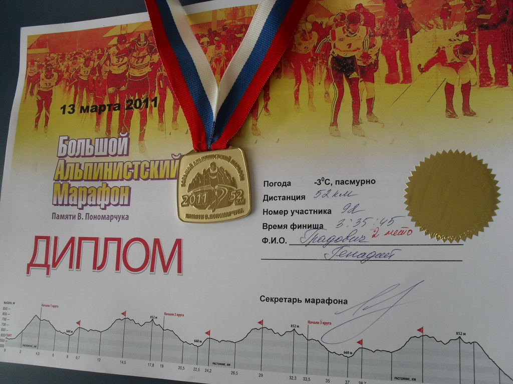 Альпийский марафон в Иркутской области (соревнования посвящены памяти Виктора Пономарчука) проводился в 31-й раз. Три года назад эти соревнования стали позиционироваться как всероссийские, и нынче – 13 марта – на старт вместе с гонщиками Приангарья вышли лыжники со всей страны: от Москвы до Южно-Сахалинска. В забеге на 52 км участвовали 250 спортсменов. Кандидат в мастера спорта Геннадий Градович в своей возрастной группе стал вторым.