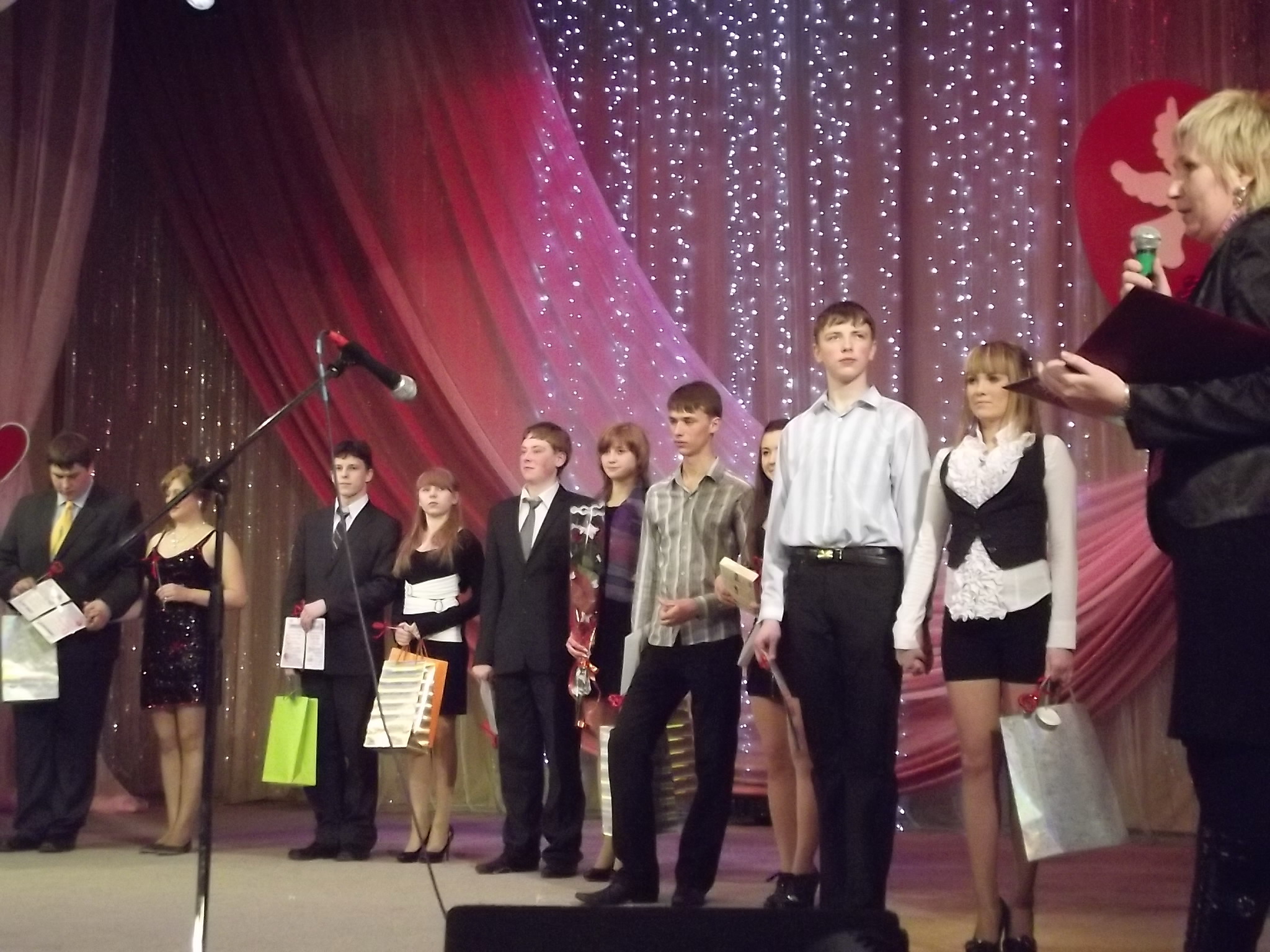 «Влюбленные творят чудеса: если преподносят цветы, то – миллион роз; если дарят подарок, то – звезду с неба; если признаются в любви, то – на весь белый свет», – сказали, открывая конкурсную программу, ведущие. И все участники, в подтверждение этих слов, оказались на высоте своего чувства. Им предстояло выполнить три конкурсных задания: рассказать о знакомстве, сделать признание в любви и совершить перевоплощение, примерив новый образ. На последнем этапе влюбленные выступили в образе литературных персонажей, первобытных людей и киногероев. Выступление оценивало жюри. Строгие судьи отметили искренность всех участников и, особо, прекрасную подготовку гимназистов, театральные инсценировки которых отличались выразительностью и остроумием. А вот победителями конкурса признаны студенты медицинского училища Николай и Наталья Пакусины.